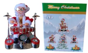 Very cool new musical Santa novelty. This one taps his foot to the beat as he plays the drums. Lights and music. Requires 3 AA batteries (NOT INCLUDED). Comes in a nice retail box.
